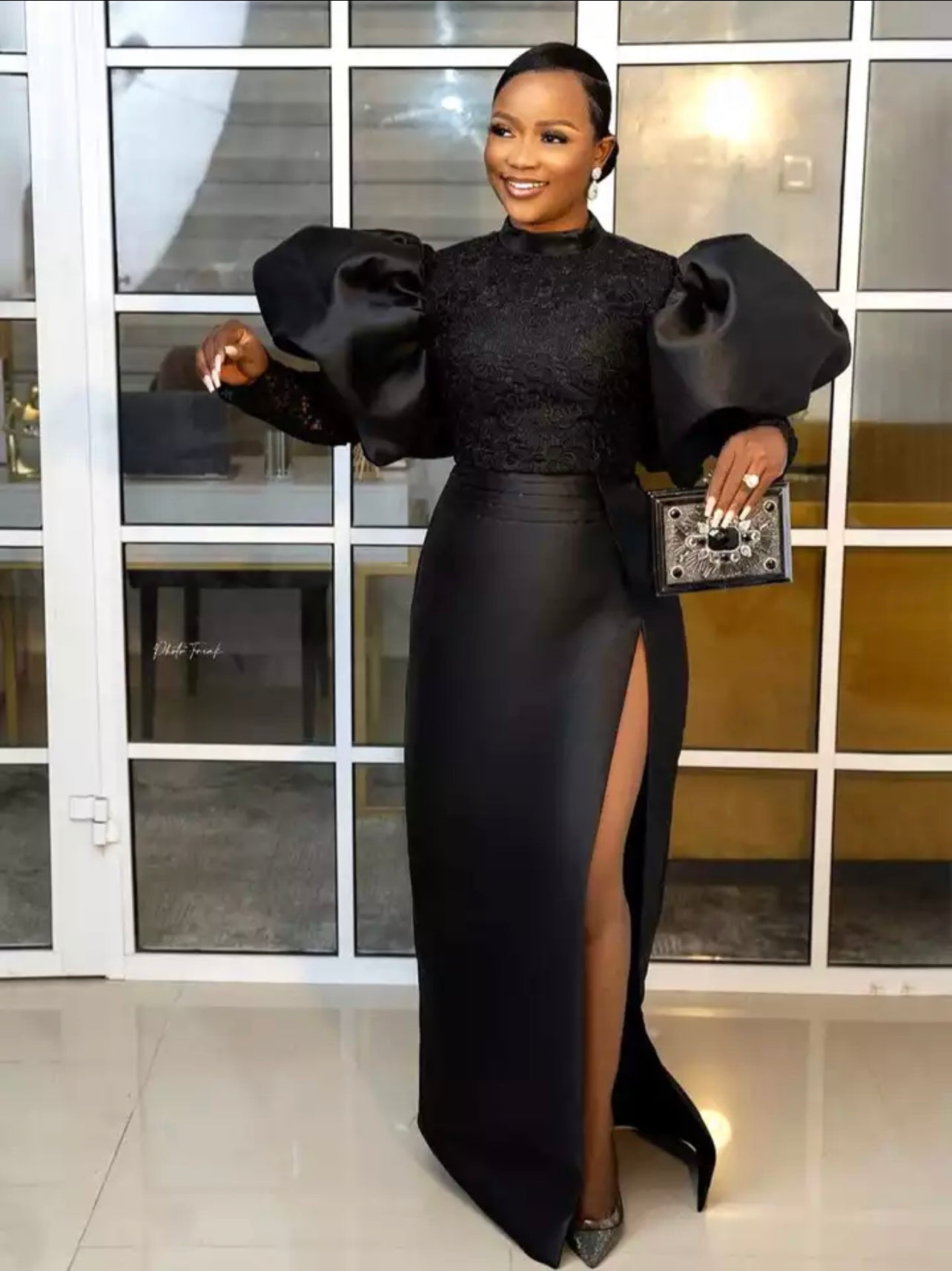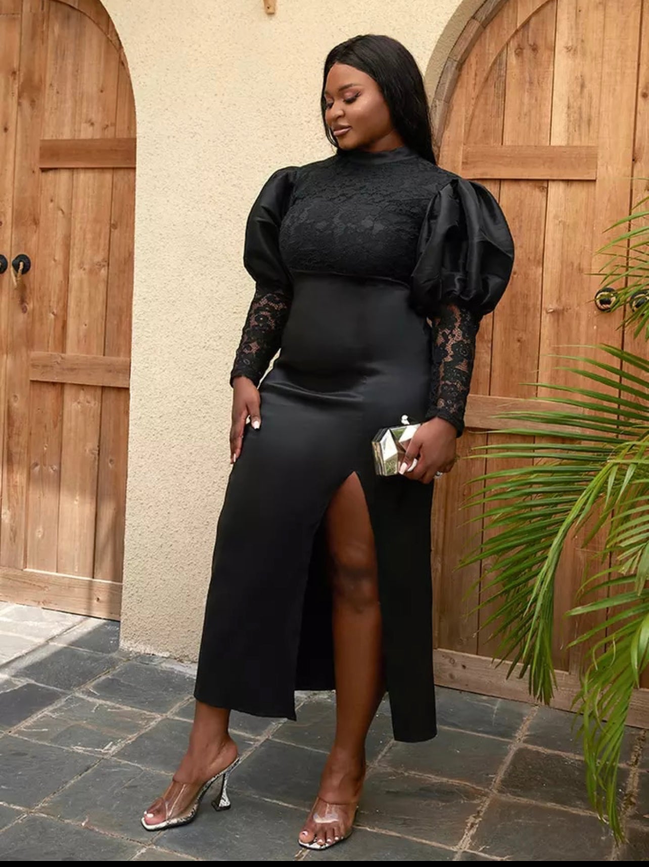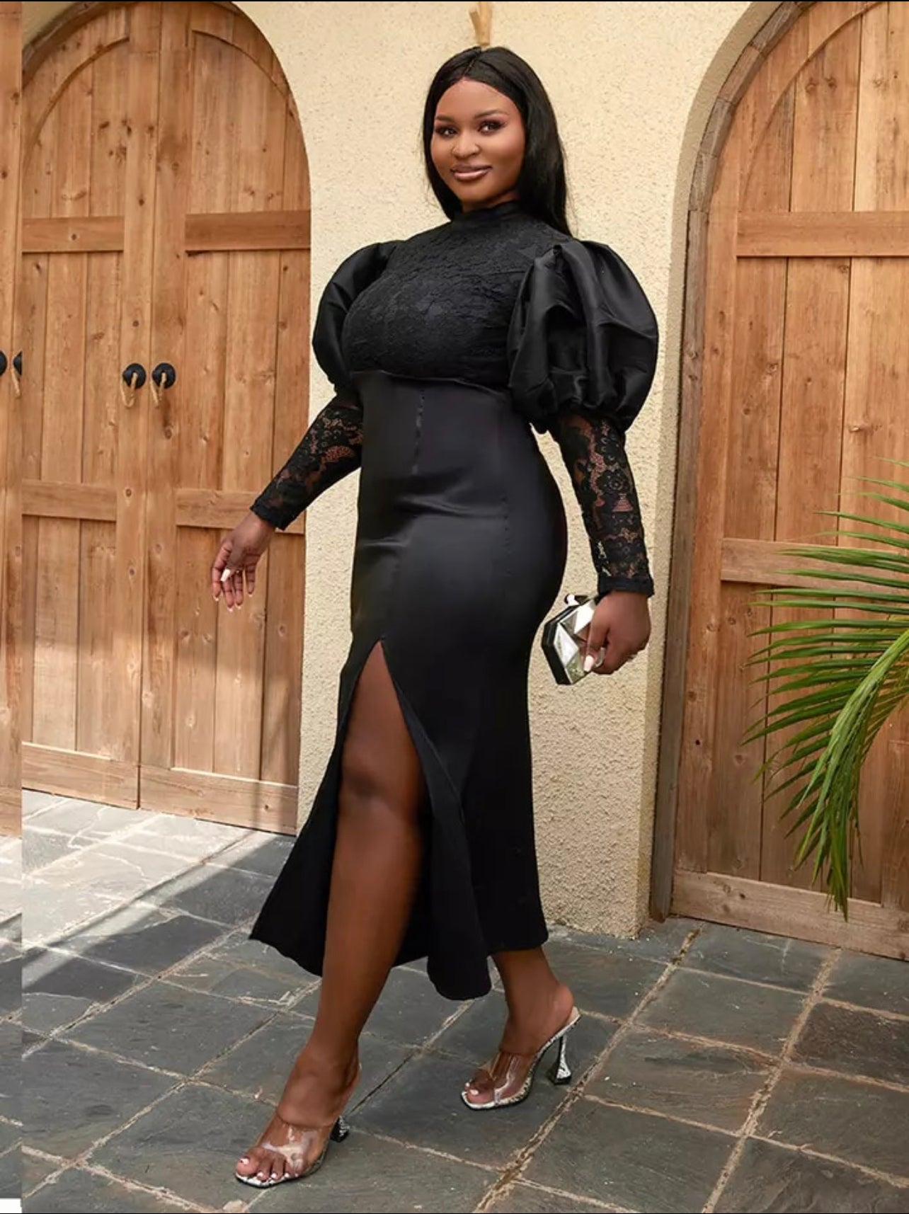 Black Party Long Dresses High Slit Women Lace Patchwork Elegant Evening Stand Neck Lantern Sleeves Robes 4XL New