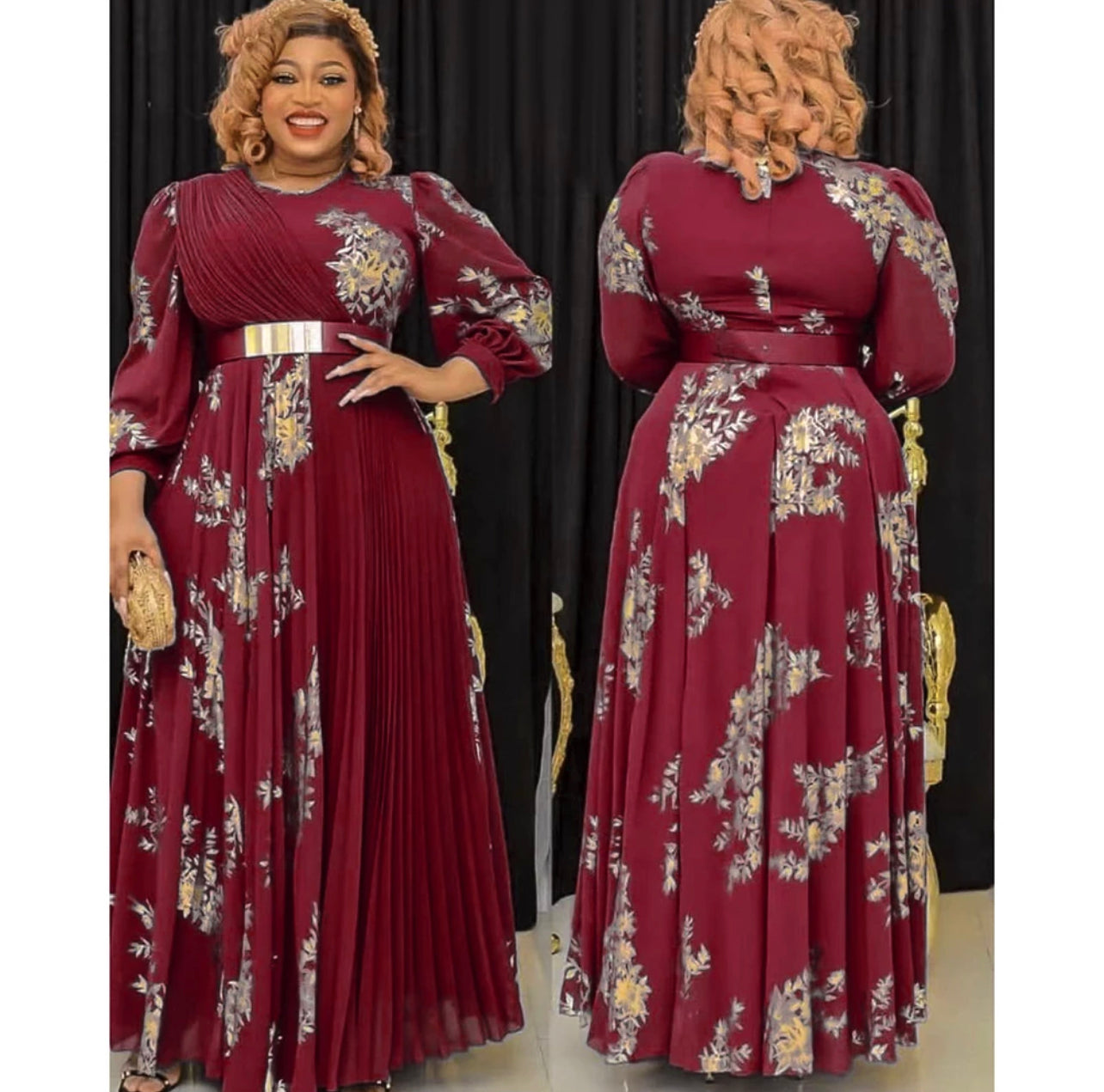 This gorgeous floor length dress comes with the belt seen in the picture. If you are unsure of the size please send us a email or refer to the size chart below